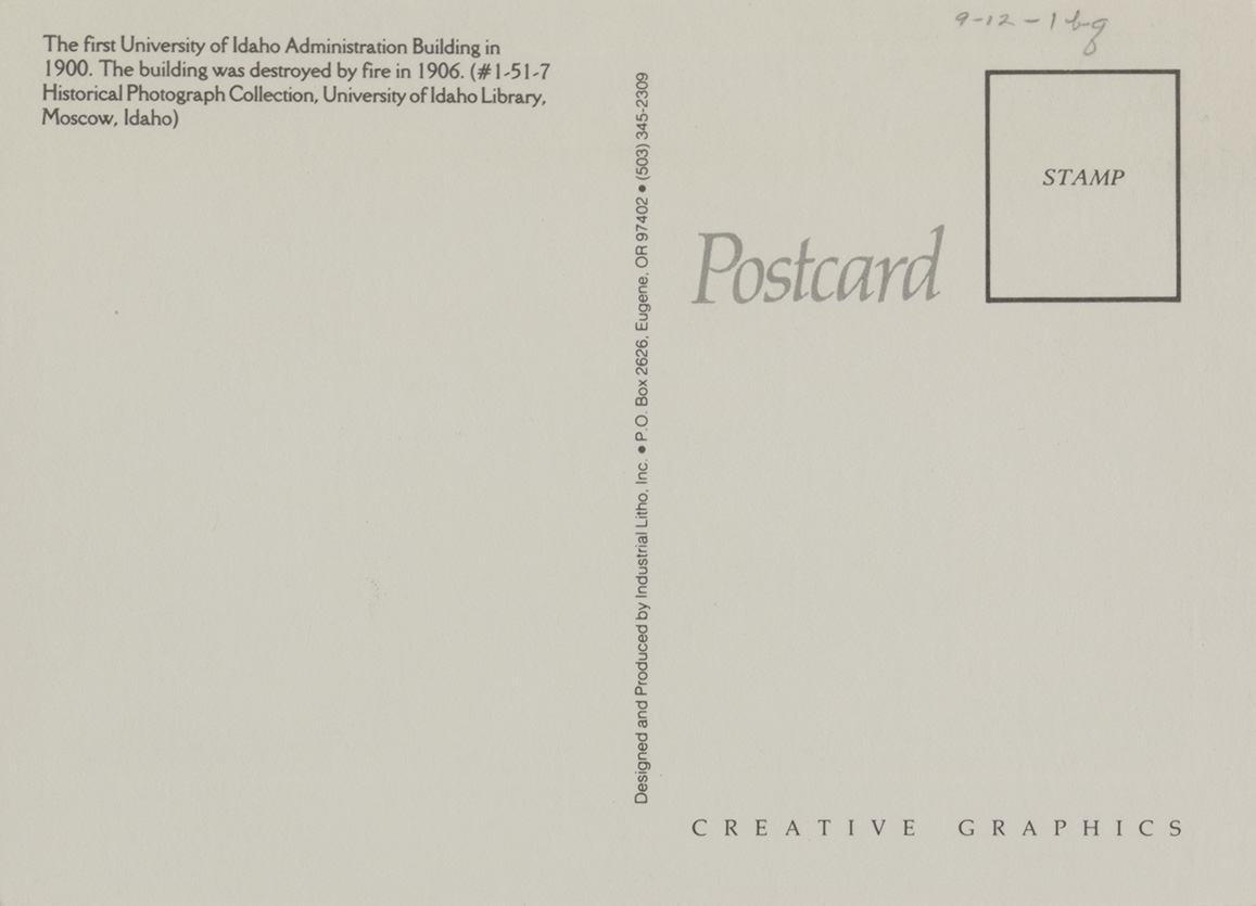 - Postcard of the first Administration building, which was destroyed in 1906, on the University of Idaho campus in Moscow, Idaho. | The first University of Idaho Administration Building in 1900. The building was destroyed by fire in 1906.
